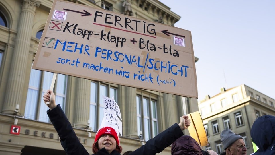 Die Demonstrierenden kritisieren insbesondere Arbeitsbedingungen, die weit hinter den Versprechen der Initiative zurückbleiben. Trotz öffentlicher Anerkennung fühlen sich viele Pflegekräfte im System alleingelassen: Es fehlen verbindliche Personalschlüssel, ausreichende Finanzierung und organisatorische Stabilität. Sie betonen, dass die 2021 angenommene Pflegeinitiative die Situation bisher kaum verbessert hat. Ohne klare Vorgaben bleibe jede Reform «symbolisch», wie viele es ausdrückten. Der Ruf nach strukturellen Veränderungen war unüberhörbar und zog sich durch die gesamte Kundgebung.
